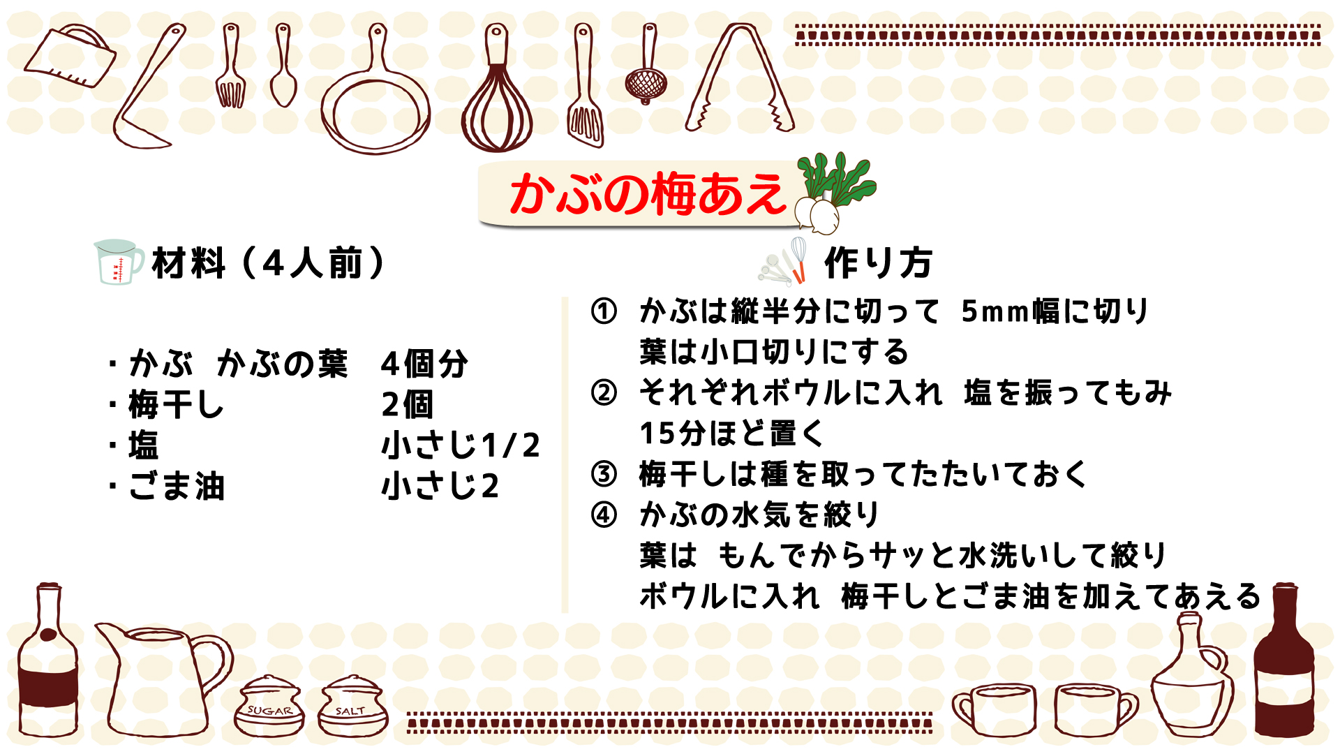 かぶの水気を絞り、葉は もんでからサッと水洗いして絞り、ボウルに入れ、梅干しとごま油を加えてあえる