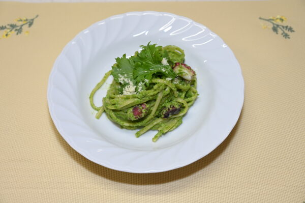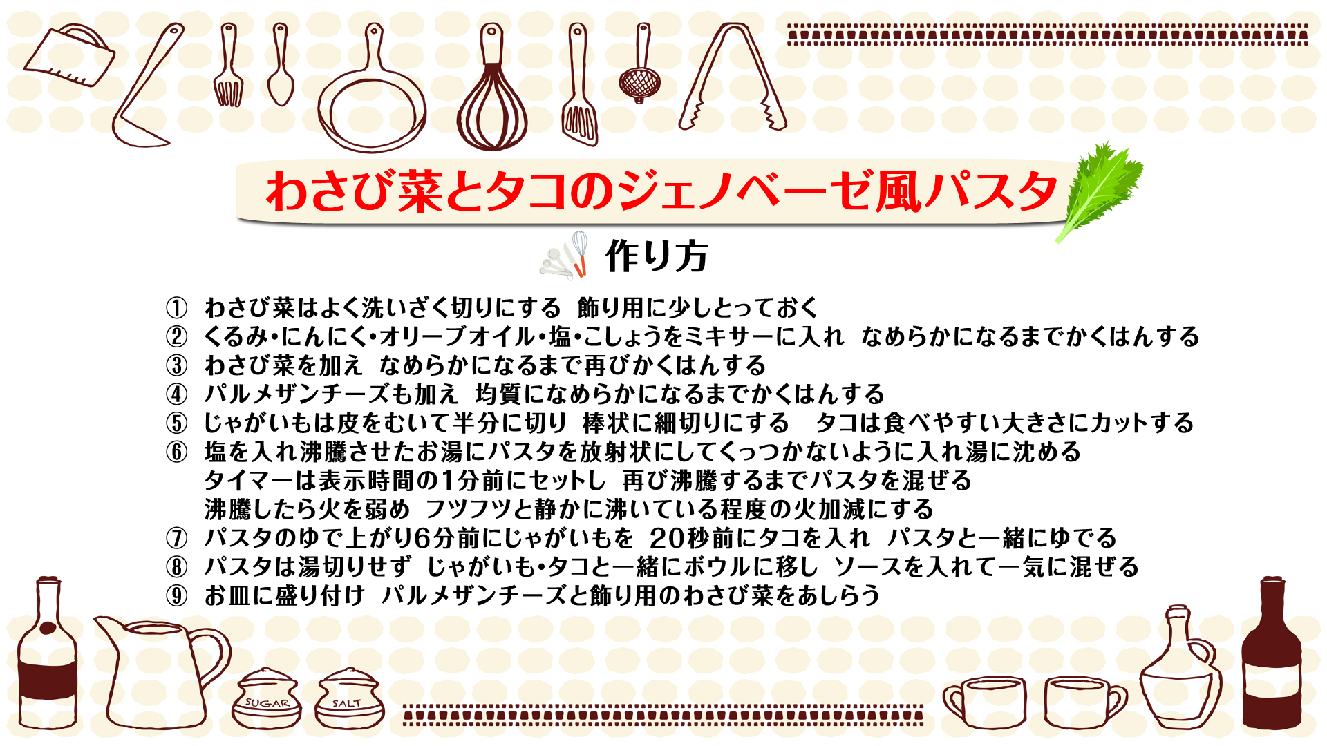 - パスタは湯切りせず、じゃがいも・タコと一緒にボウルに移し、ソースを入れて一気に混ぜる